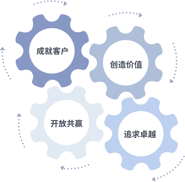 成就客户是一切决策的出发点,,创造价值是衡量所有工作的标准,,,追求卓越是我们做事做人的态度,,,开放共赢是我们的格局也是最终的结果。。。价值观的齿轮环环相扣,,,,推动着组织里的每个人不断向前。。。。